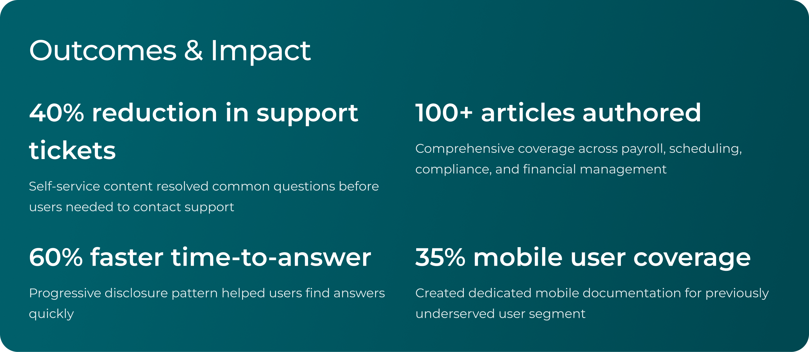 This knowledge base transformation demonstrates my ability to think strategically about content at scale. Rather than just writing individual articles, I designed a content ecosystem that serves different user needs across their entire journey—from initial setup through daily operations to complex compliance scenarios. The multi-dimensional architecture, progressive disclosure pattern, and platform-specific guidance show that great content strategy considers user context, cognitive load, and discoverability. By reducing support volume by 40%, I proved that well-structured, user-centered documentation is not just a nice-to-have—it's a critical business lever that improves user experience while reducing operational costs.