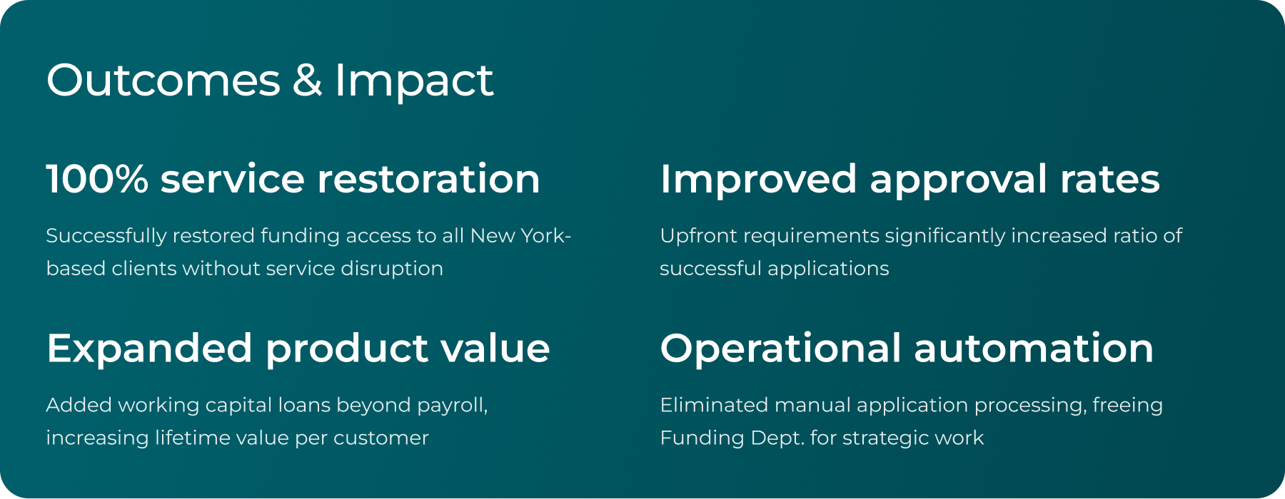 Our previous funding partner, I***** Capital, became unable to service clients in New York—our largest market. This created a 'funding desert' for a majority of our user base. Additionally, the existing solution was one-dimensional, offering only payroll-specific loans. The Payroll Funding Department was heavily involved in manual application processing, creating operational bottlenecks and limiting scale.